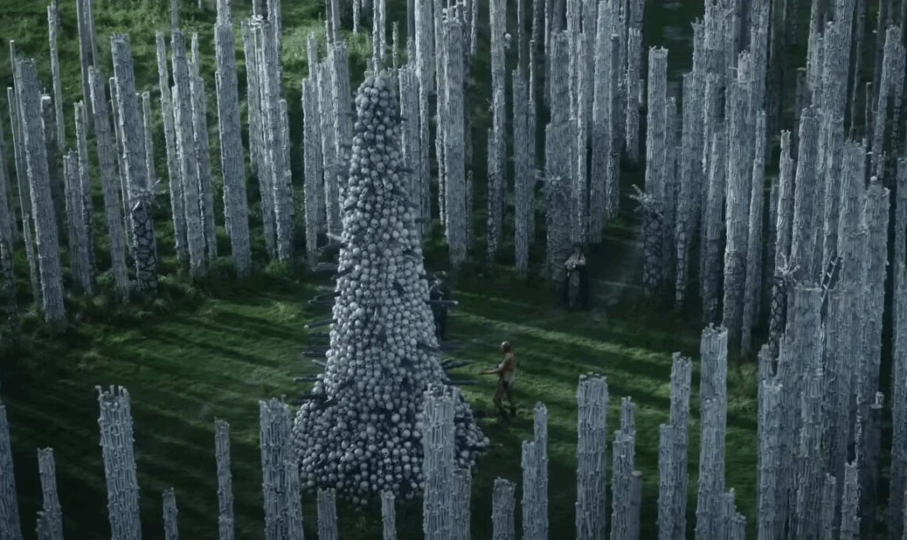 After his first visit to the mainland Spike returns with his mother Isla who is suffering from an unknown illness to find Dr. Ian Kelson, played by Ralph Fiennes, for help. In the second half of the movie Spike learns that death and love are just as important as each other when he finds out that Isla has brain cancer. She is ultimately euthanised by Dr. Kelson and Spike is given her skull to place atop a tower of skulls, symbolizing his acceptance of her death. While this half of the film provides an emotionally stirring contrast to the initial sequences of violence, the two halves almost feel like separate stories, causing the movie to feel slightly disjointed.