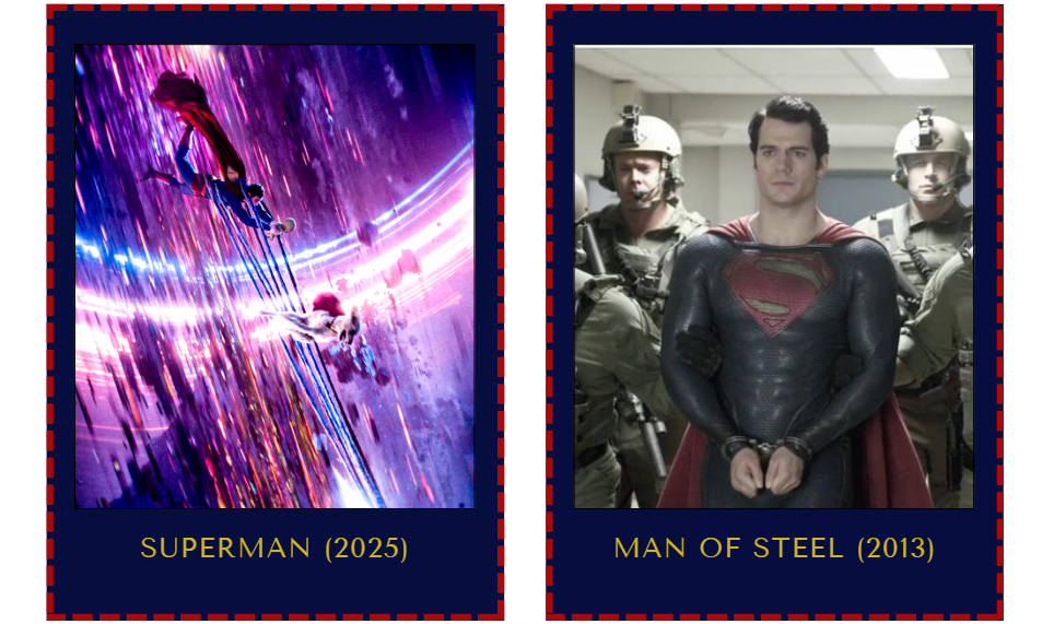 Superman (2025) can be seen distinguishing his film from its predecessor, Zack Snyder’s Man of Steel (2013). In which, Snyder’s envisioned Superman portrays a brooding, “god” against men struggling to reconcile his power alongside morals. However, Gunn’s interpretation presents a tone of optimism and moral clarity. David Corenswet embodies the Superman fans have grown up with selflessness, approachability, and a commitment to the double life of superhero and journalist. Gunn’s writing not only aligns with source material but also contrasts the nature of Superman’s dual identity. Through presenting Clark Kent as a comic accurate, awkward and clumsy individual, he highlights the implausibility of others recognising his alter ego, reinforcing the stark polarity between Superman’s composed and heroic presence, we had yet to see in Man of Steel.