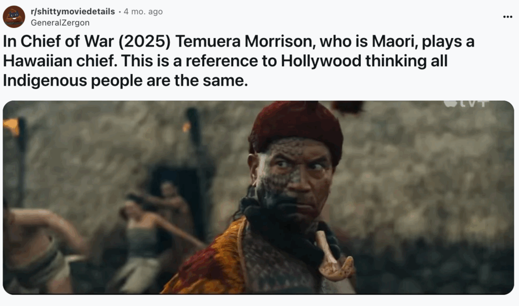 Temuera Morrison justified his casting to Nerds of Colour by saying that Jason Momoa needed some talented Polynesians around him, “Jason said to me, “Look, we’re the same people, bro. We’re the same people.” And so, taking into account, I decided to warm to the idea. And I thought, well, he needs some experienced Polynesian actors around him. I’m talking about Jason. So I decided to get stuck in.” 11 years on since the establishment of the UH MFA program, any claims that there is no experienced Hawaiian actors by the Chief of War cast is flat out erasure and ego.