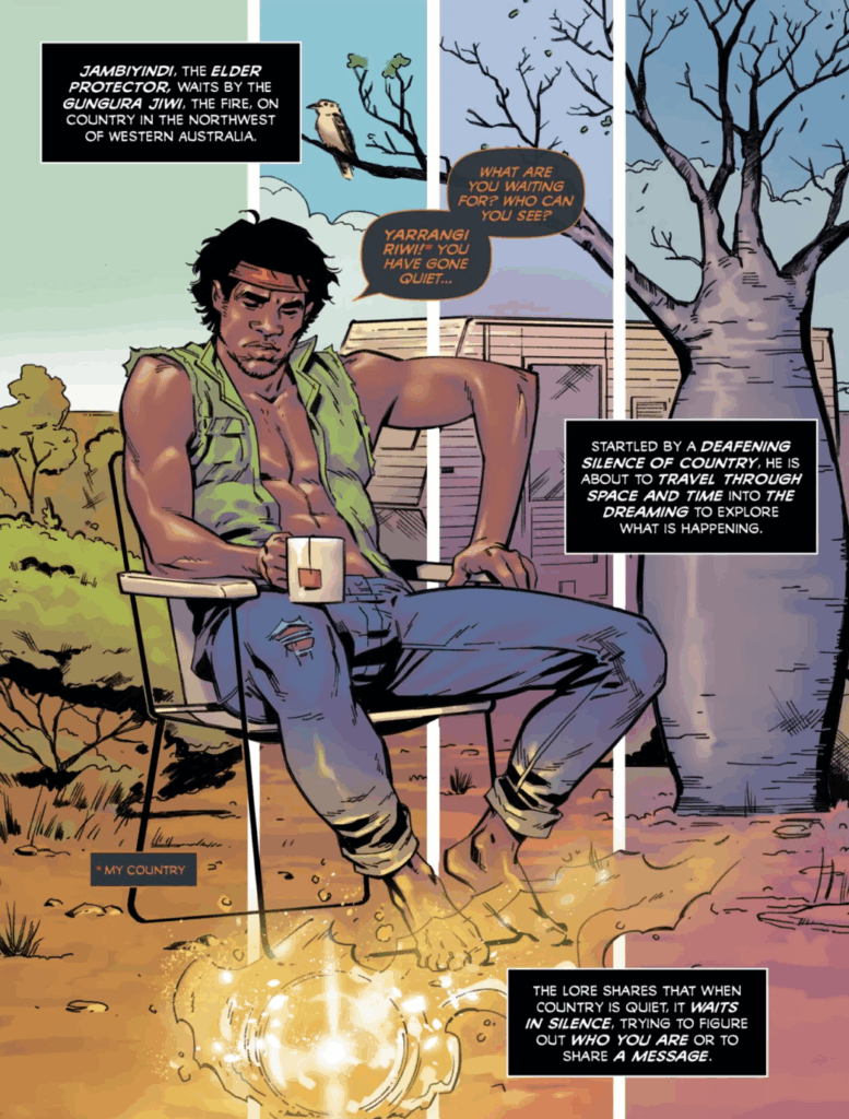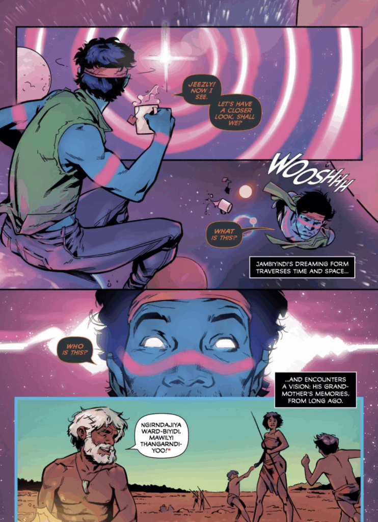 When speaking to NITV, Wilson encapsulates his universe as, “The Indigiverse is all about the oldest living cultures inspiring the newest living superheroes.” You get this sense throughout the comic, as you see the Dreaming allows people to leave their physical form and travel to other dimensions. I particularly love and am inspired by the fact that kinship and earth elements transform into both superpowers and temporal weapons for Mangala and Jambiyindi. It aligns with global Indigenous notions of time being non-linear. Encapsulated in their essay, ‘Does Māori Art History Matter?” Professor Deidre Brownn (Ngāpuhi, Ngāti Kahu), Ngarino Ellis (Ngāpuhi, Ngāti Porou) and Jonathan Mane-Wheoki (Ngāpuhi, Te Aupouri, Ngāti Kuri) propose that in Te Ao Maori (The Māori worldview),