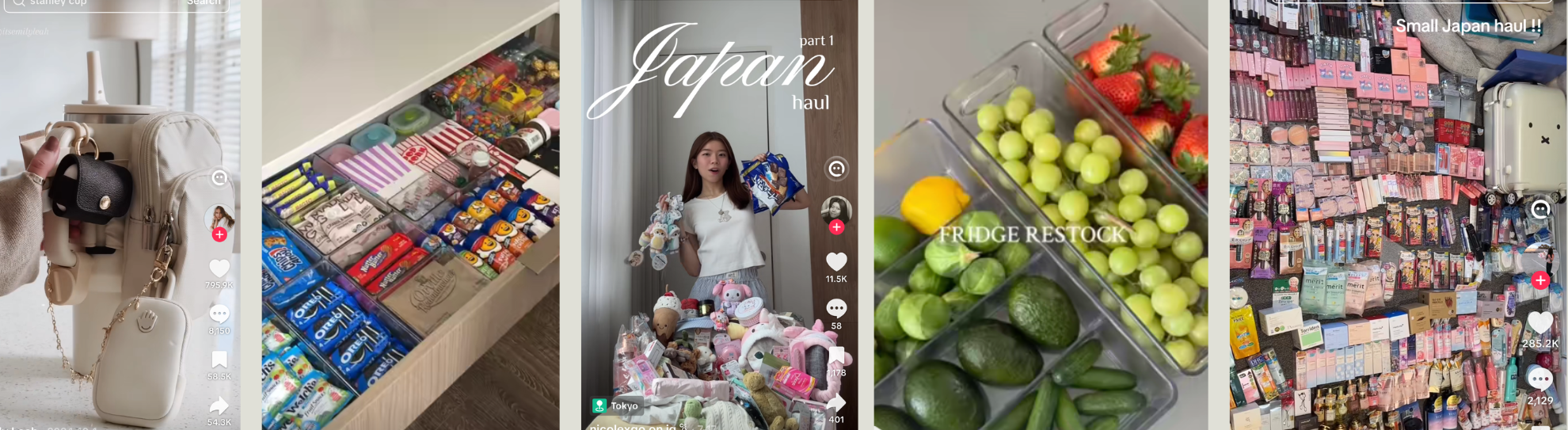 The prevalence of materialistic content in the digital space reframes the once-frowned-upon overconsumption into marketable online entertainment. In recent years, particularly on TikTok, social media has been inundated with content revolving around unnecessary consumption. One trend guilty of this is the restock content, which consists of “visually, aesthetically and auditorily pleasing” short videos that showcase the replenishment of supplies and items (Riboni & Ringrow, 2025, p. 2). Rochelle Stewart of @operation_niki is a prominent creator in this space, featuring exaggerated and often absurd gadgets in her restock videos, including a snack compartment for a Stanley Cup and a penguin-shaped fridge air freshener. At the same time, Catherine Benson of @_catben_ content revolves around transferring items from one perfectly functional container into a newly purchased “more aesthetic” plastic container. For other creators, content follows a repetitive cycle: purchasing, restocking, and then decluttering to make room for yet another major purchase.