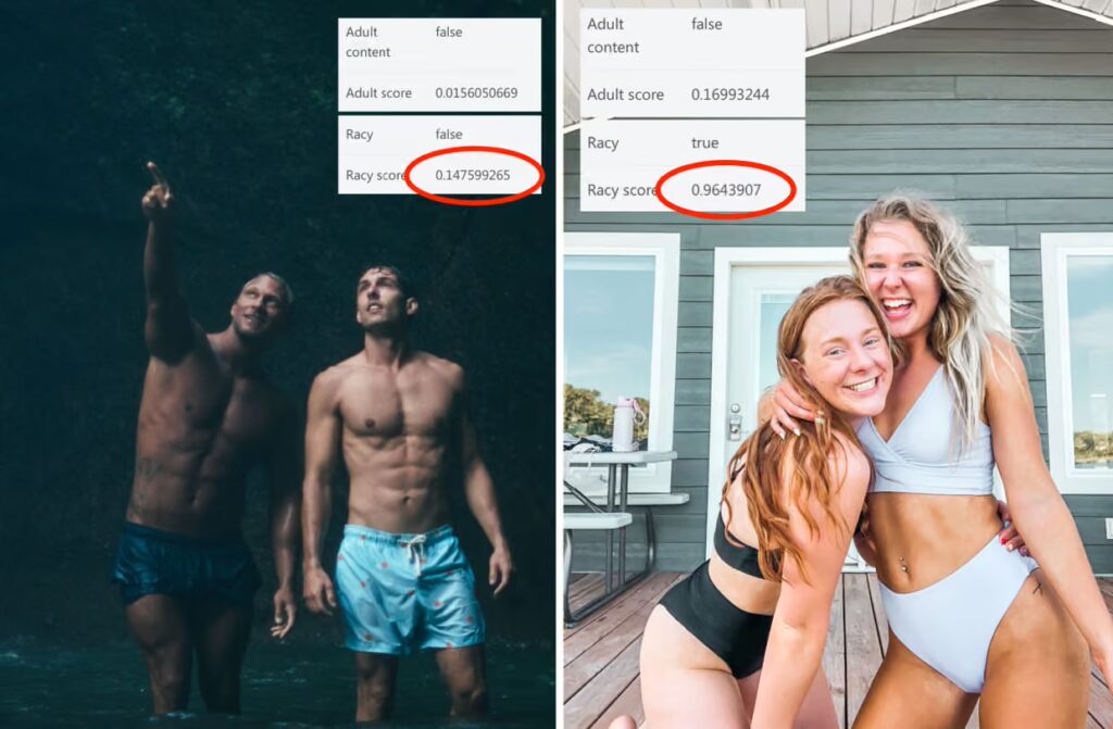 Take another look at the photos below. Do you think they are too revealing? These are two photos from LinkedIn, featuring two men and two women wearing swimwear. However, in these two photos showing both genders in swimwear, Microsoft’s tool classified the photos of the two women as pornographic content, assigning them a 96% rating. The mens’ photo, on the other hand, was classified as non-pornographic content, scoring 14%. The women’s photo received 8 views within an hour, while the man’s photo garnered 655 views. This suggests the women’s lingerie photos were either blocked or covertly restricted.