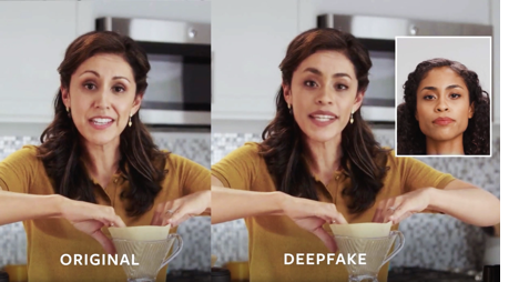 Deepfake technology replacing a person’s face in a video, transforming original footage into manipulated content.