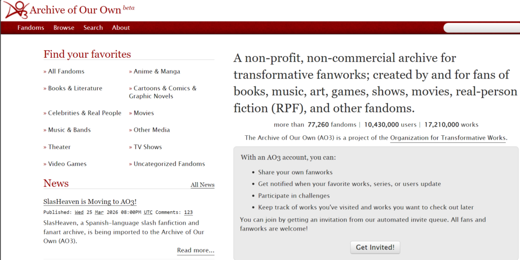 Screenshot of the homepage of AO3