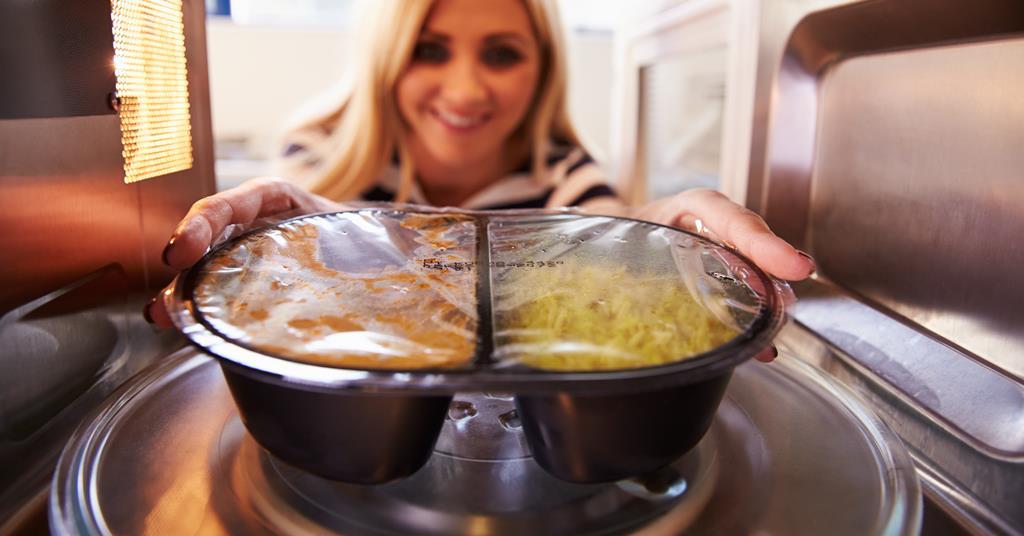 Caption: A woman puts a ready-to-eat meal into the microwave to heat it up